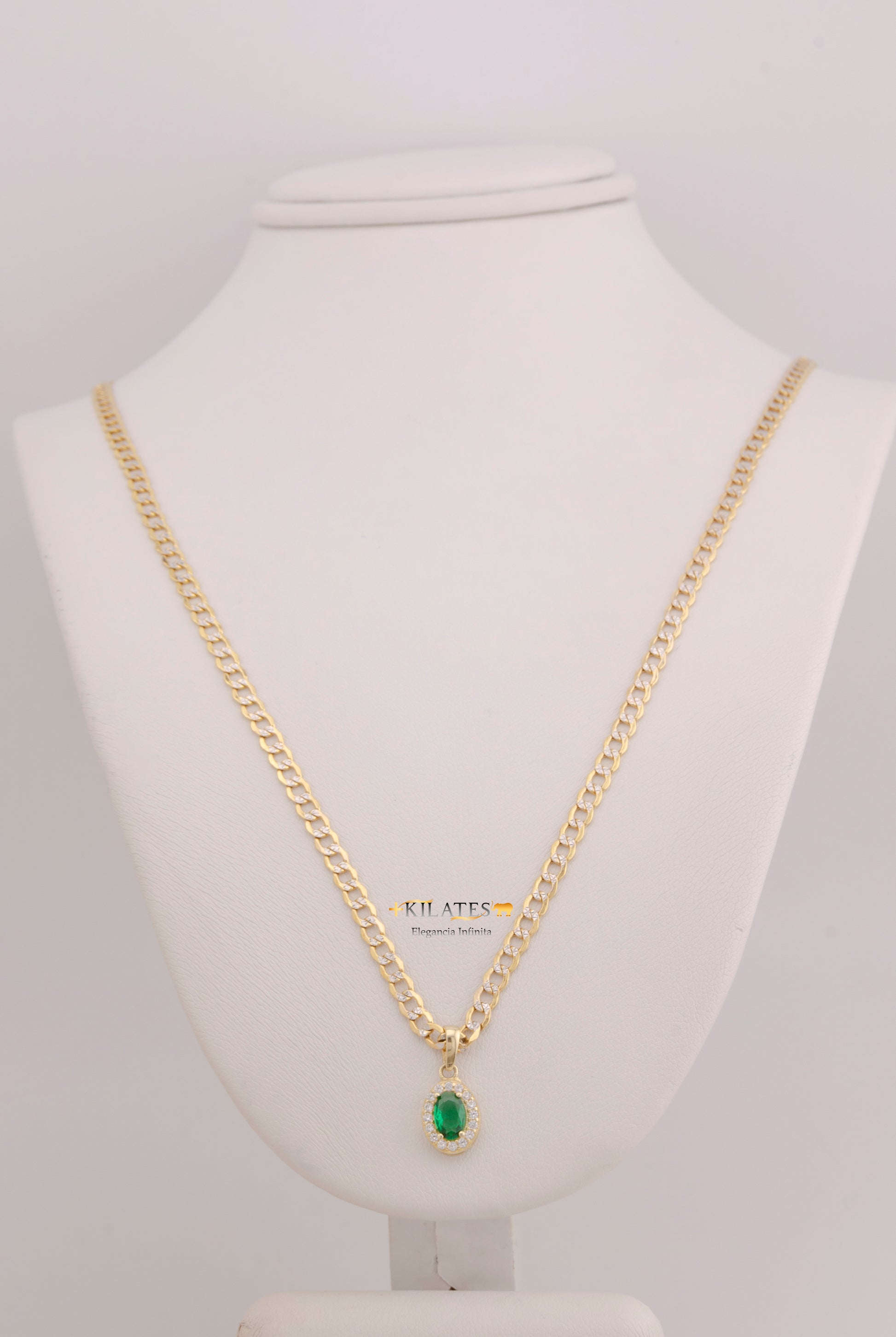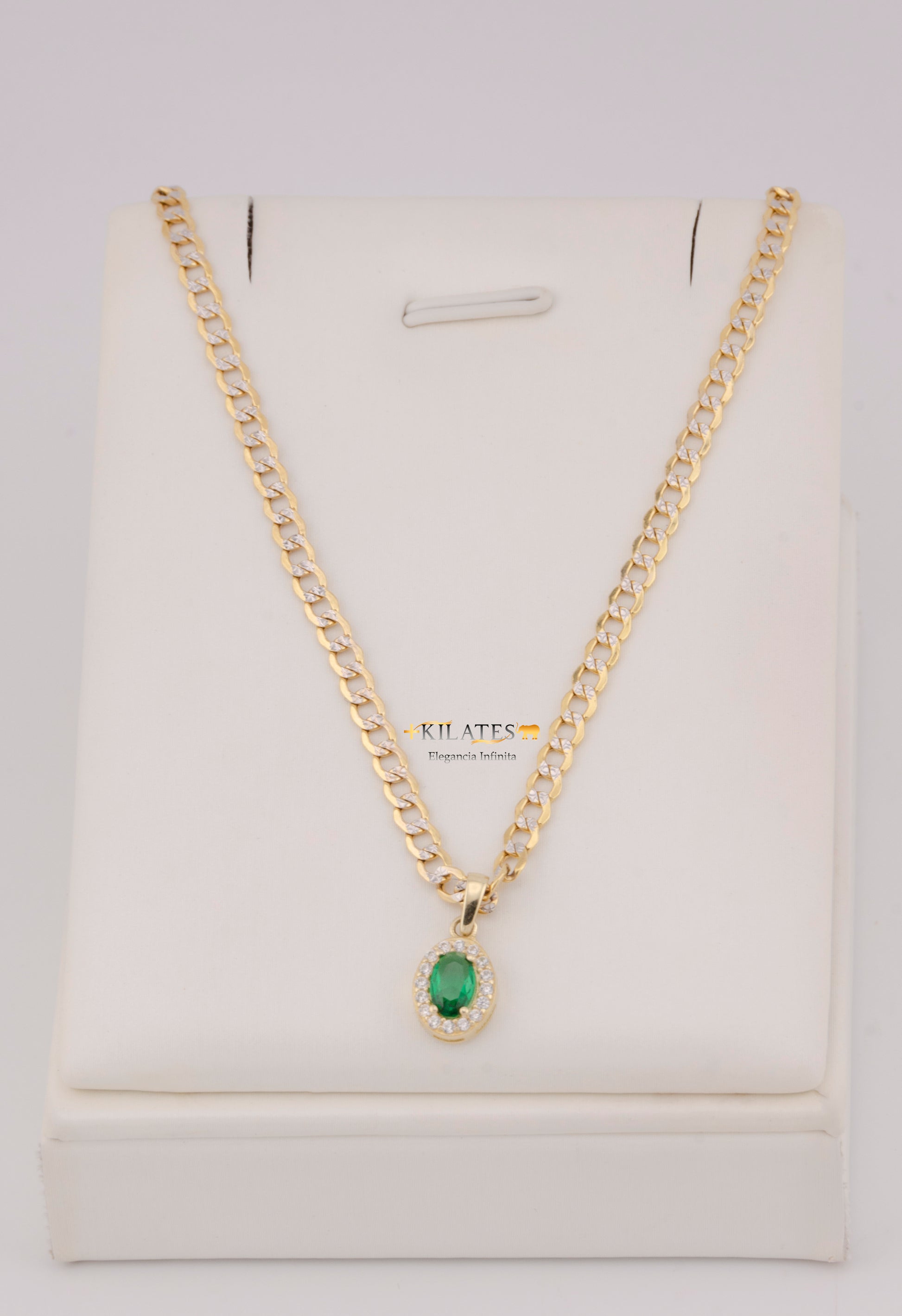 "CADENA DE 50CM PARA DAMA ESTILO CUBANA DIAMANTADA CON DIJE OVALADO BLANCO CON VERDE. ORO 10K #775-3845"