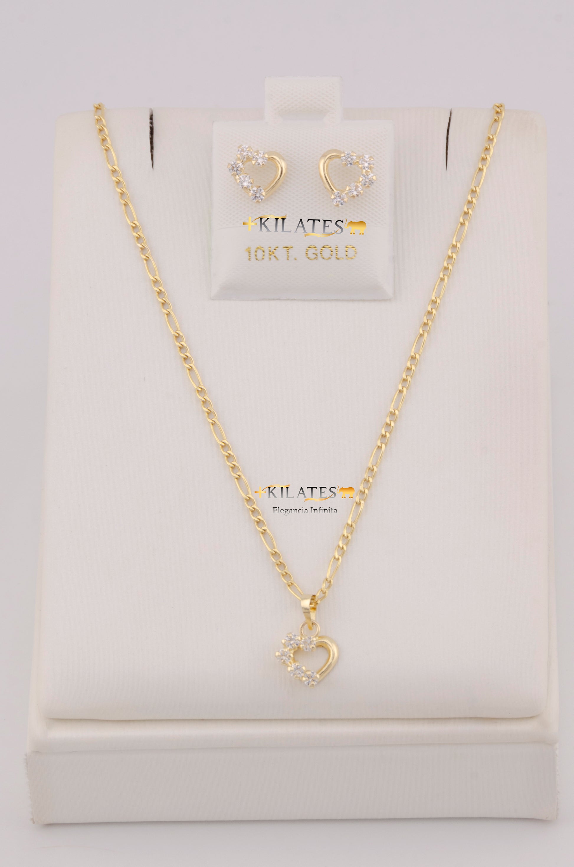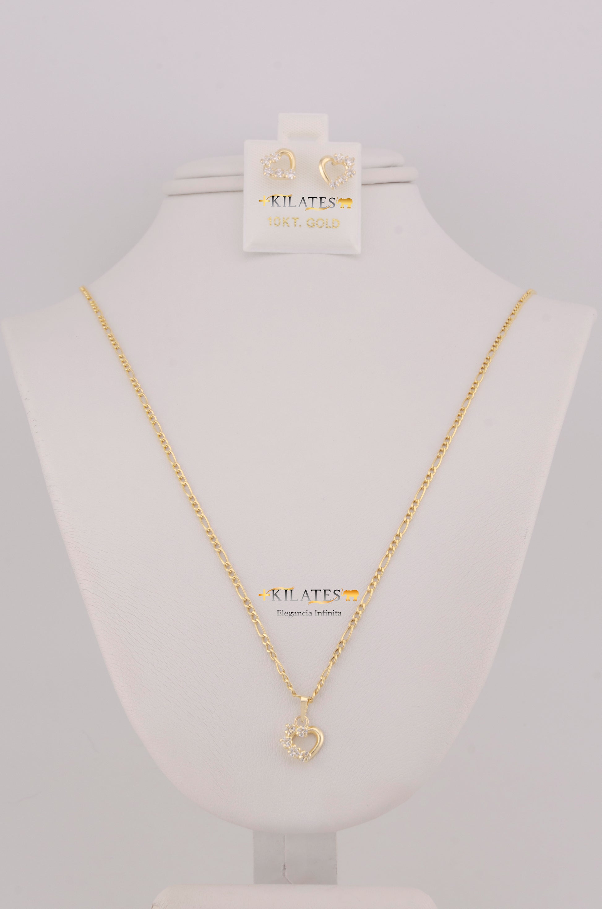 "SET DE CADENA ESTILO 3+1 DE 50CM PARA DAMA CON DIJE Y ARETES DE CORAZON CON ZIRCONIA BLANCA. ORO 10K #775-3815"